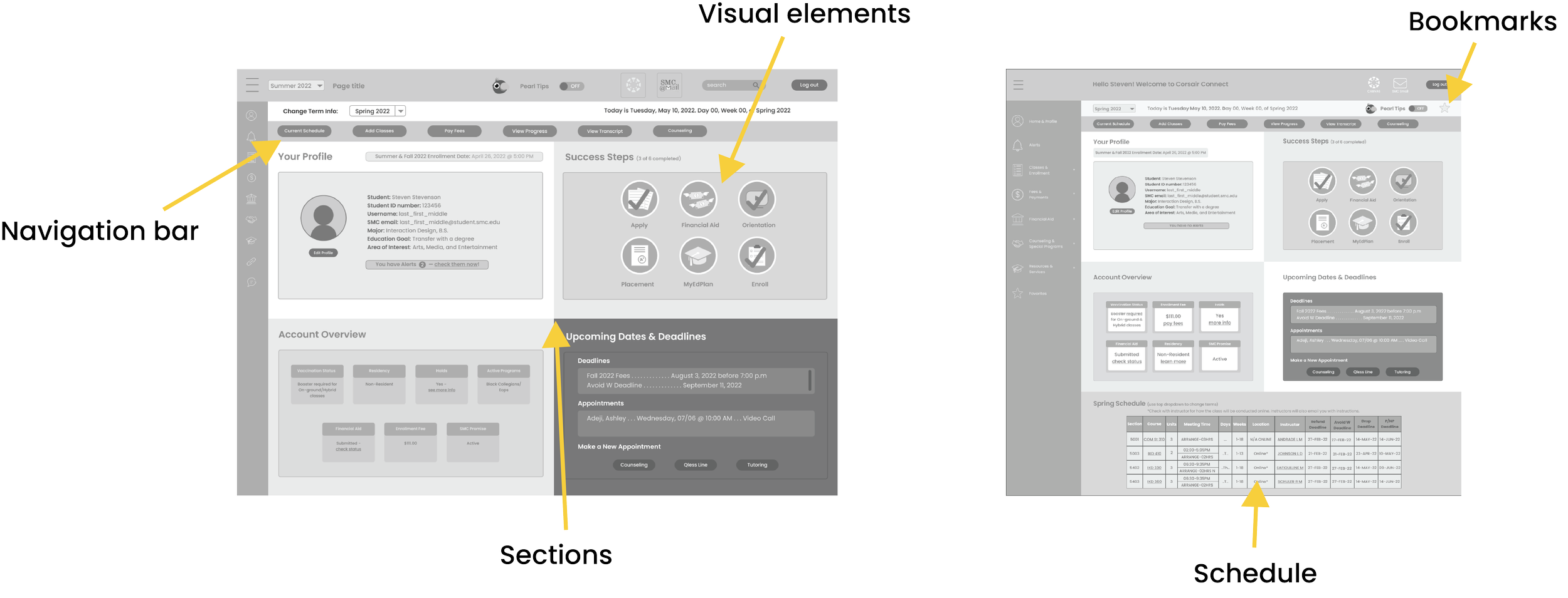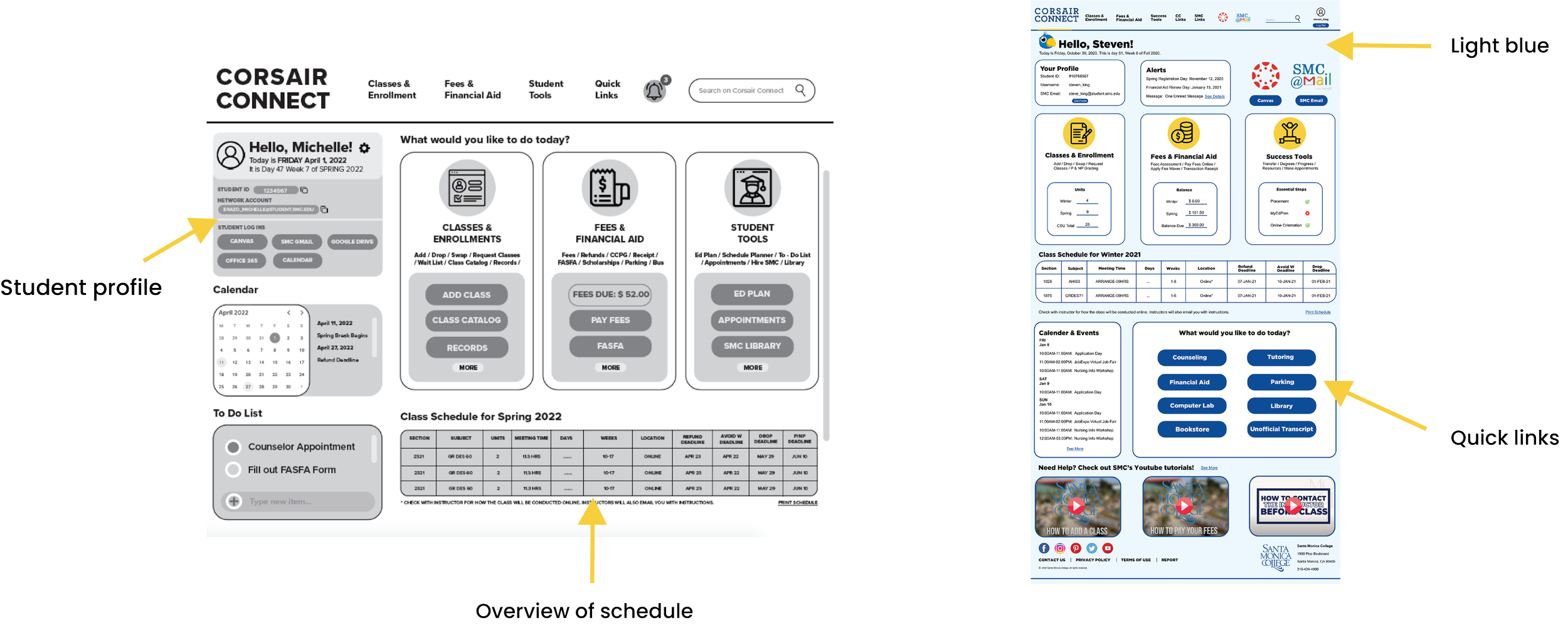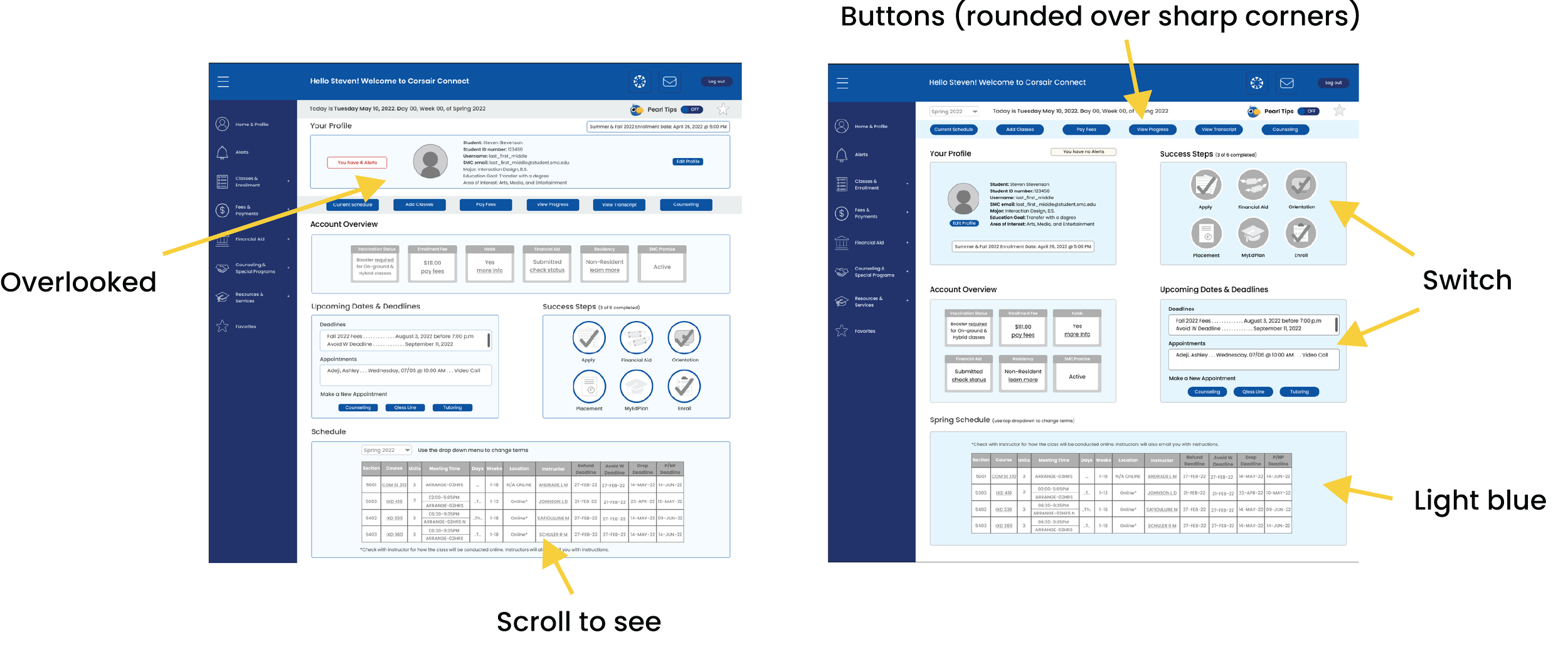 As the layout evolved, navigation improved with buttons for frequently used links or student-requested info. Icons in the Success Steps section could reduce text and gamify tasks by allowing users to check off badges as they complete steps.