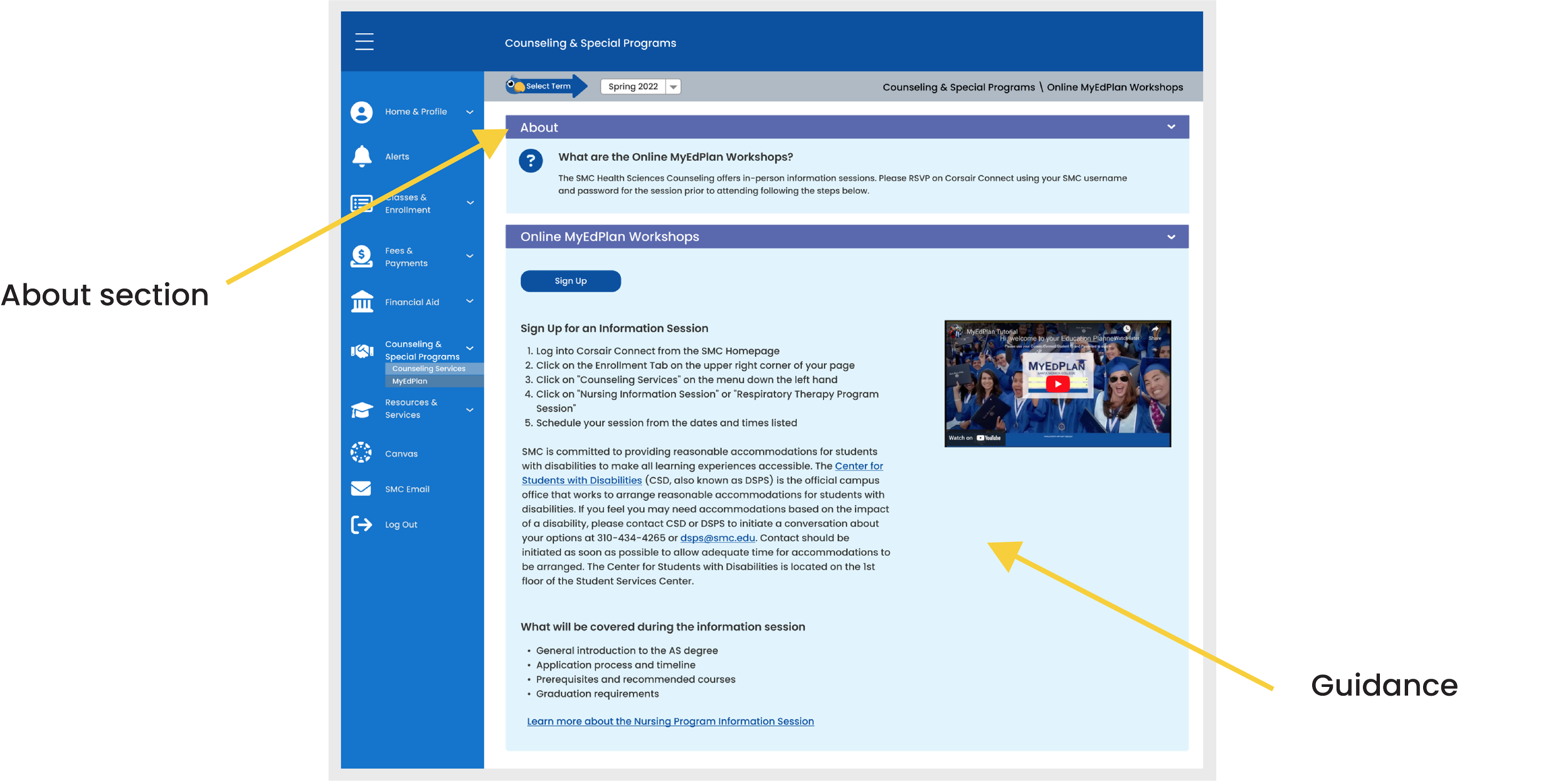 Another way to help students navigate their college experience is to provide useful information. The “About” sections introduce the pages and further guide users by providing tools for action (e.g., hints, required steps, and video tutorials).