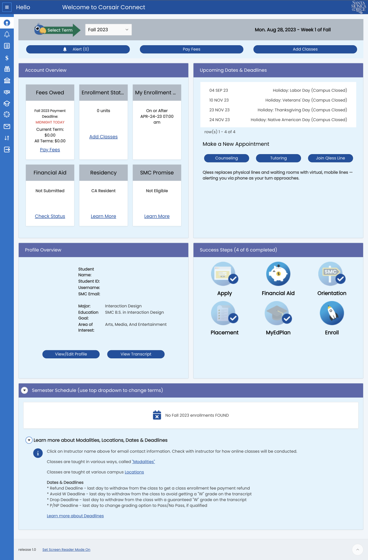 One constraint was the limited color options for main elements. To simplify the process, we used Apex software themes, saving the developers time and aligning with Santa Monica College’s existing portal systems.